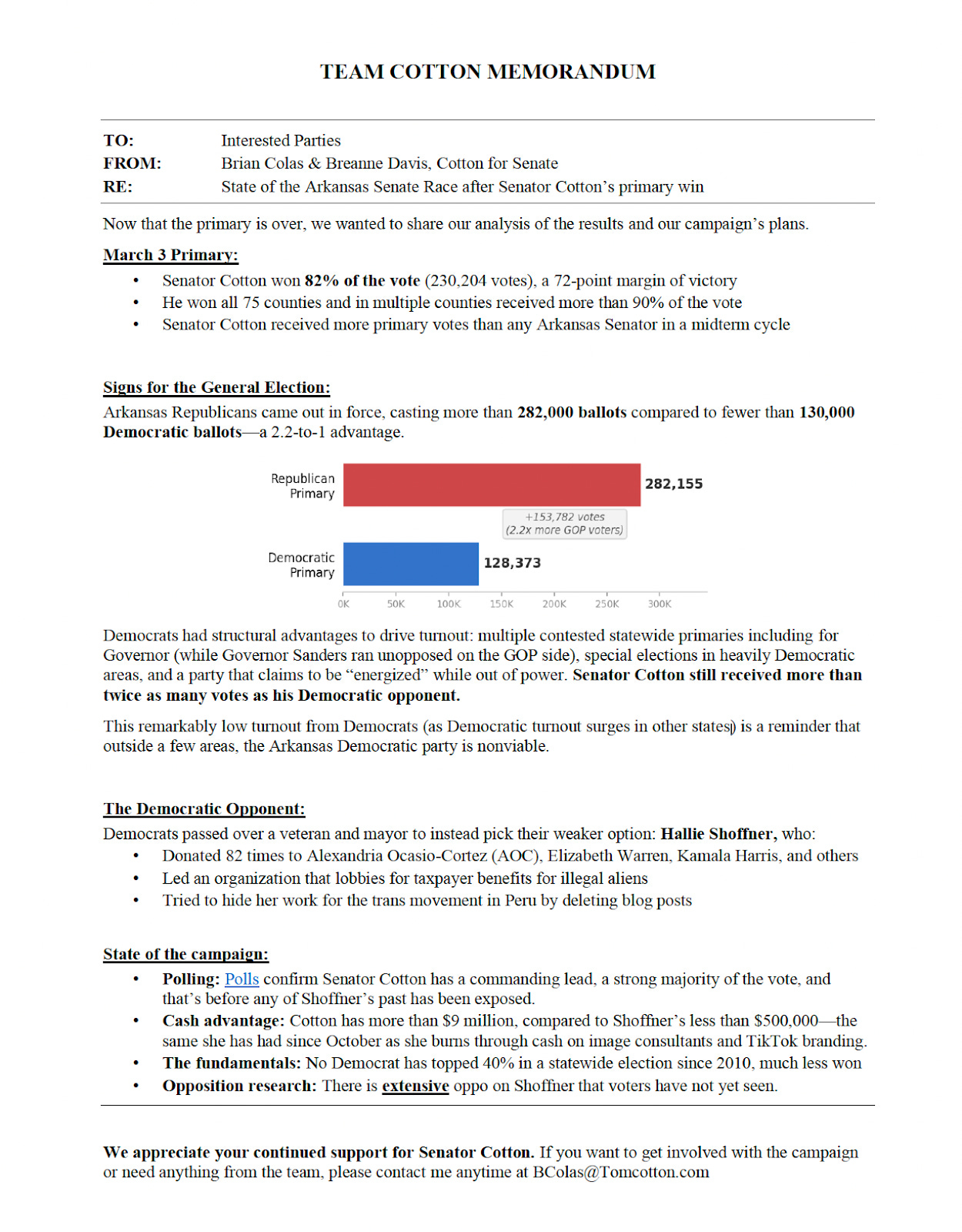 A campaign analysis shared exclusively with the Arkansas Reporter reinforces that picture. The memo, written by Brian Colas and Breanne Davis, who lead Cotton’s reelection campaign, argues that both turnout data and political trends show Democrats facing steep structural challenges this cycle.